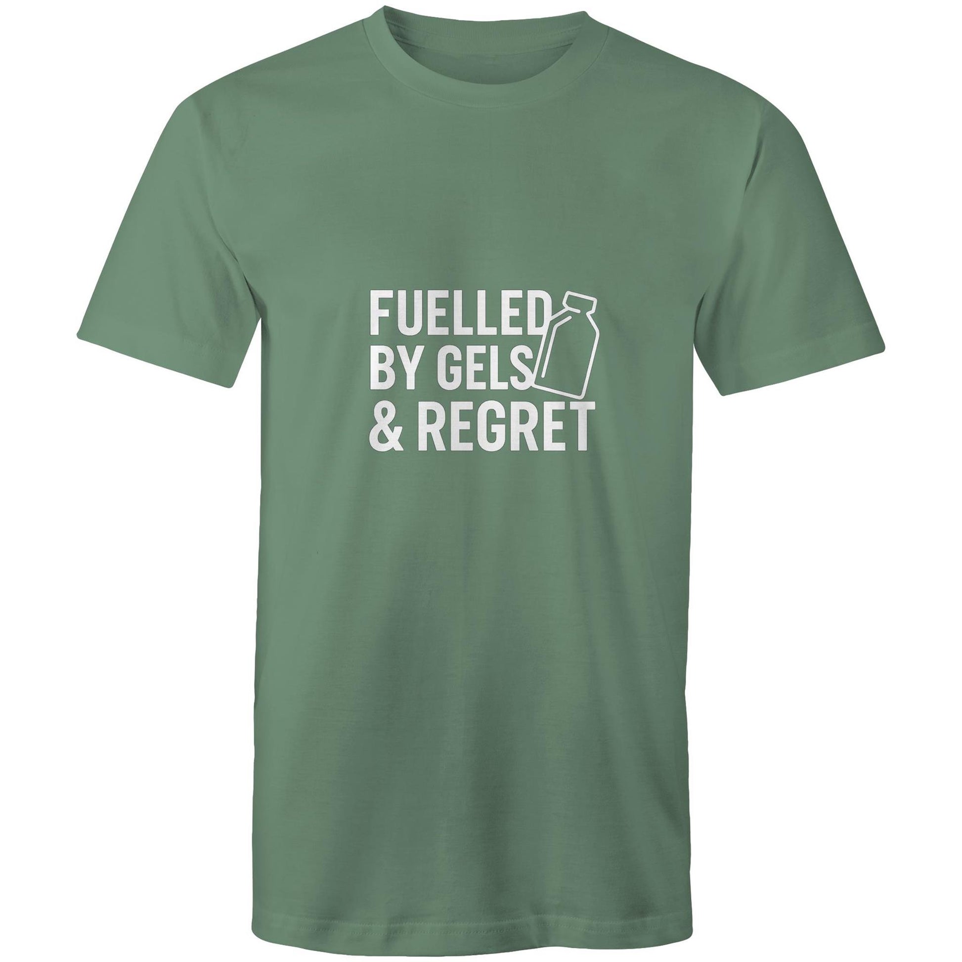Energy gels: the promise of watts in a packet — and the regret that follows. The Fuelled by Gels & Regret Tee is for riders who know that sticky hands, questionable stomach choices, and a mid-ride sugar crash are all part of the cycling experience.
